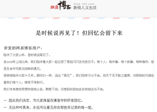 2018年11月30日00:00,將正式停止網易博客網站運營,關閉服務器,屆時及以后用戶將無法登陸網站。